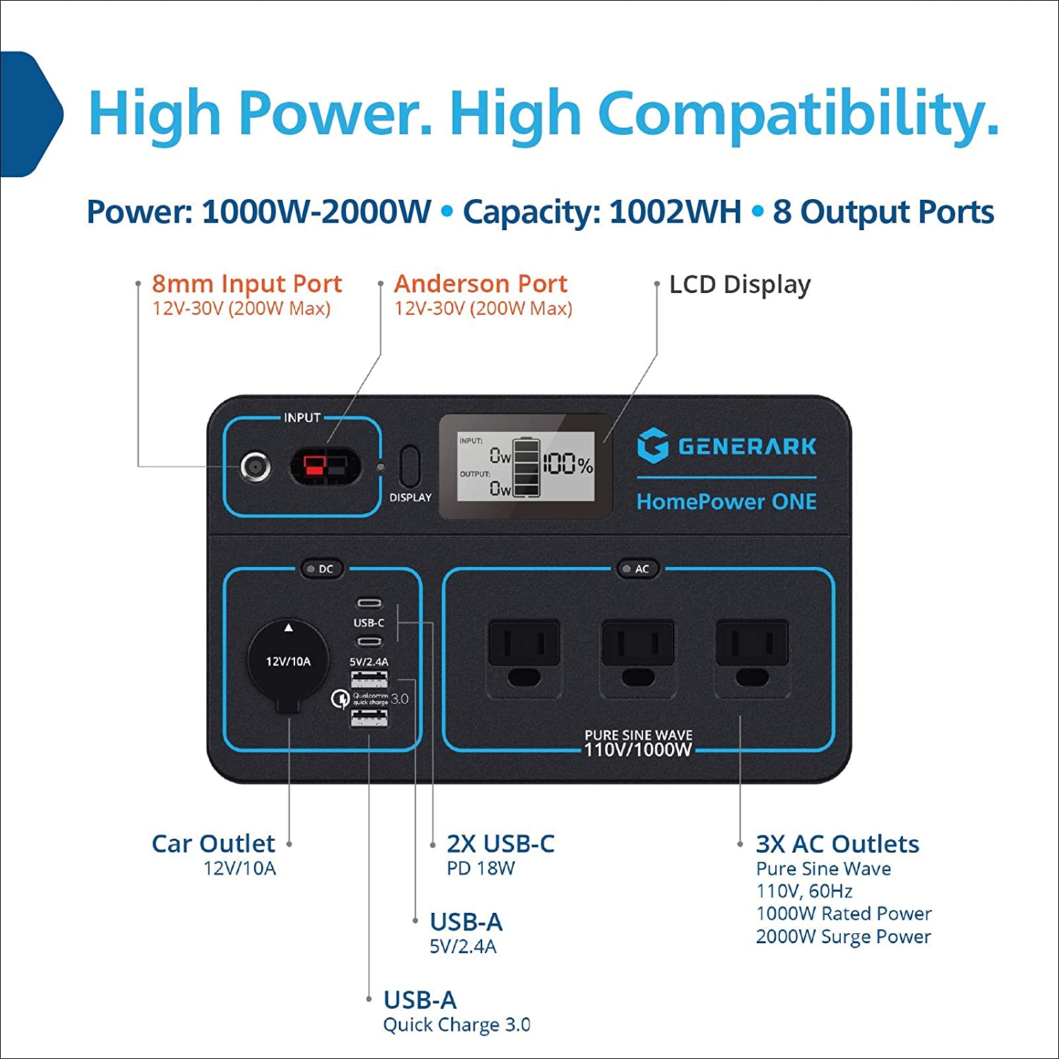 Geneverse 1002Wh (1x2) Solar Generator Bundle: 1X HomePower ONE Portable Power Station (3X 1000W AC Outlets) + 2X 100W Solar Panels. Quiet, Indoor-Safe Backup Battery Power Generator For Home Devices