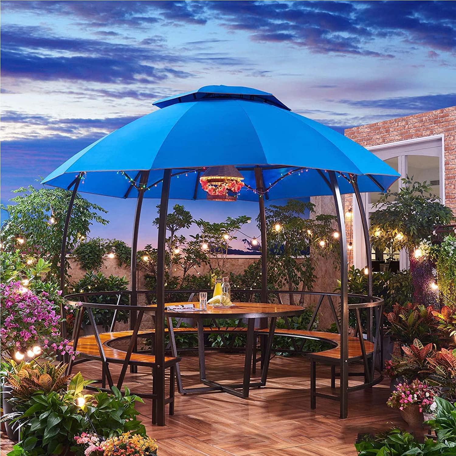 【Gazebo】Double Top Gazebos for Gardens, Castle Pergola with Chair & Table for Outdoor Courtyard Garden Villa