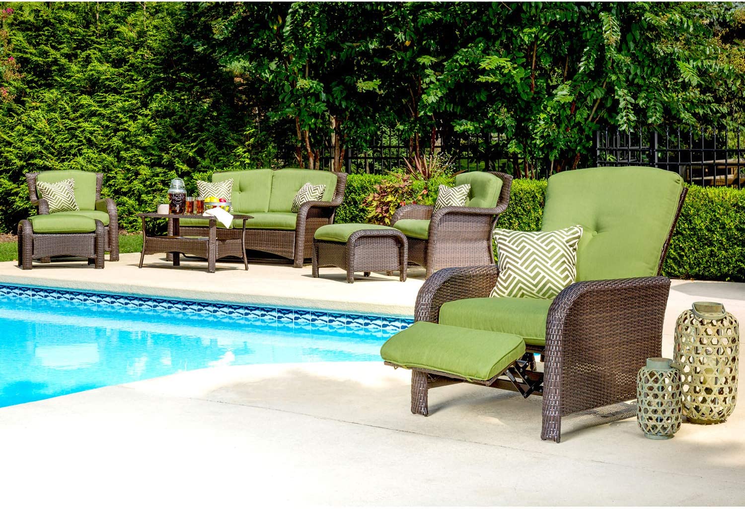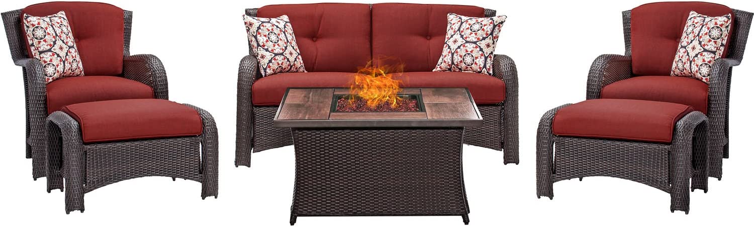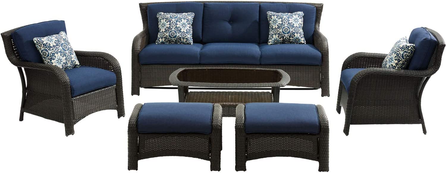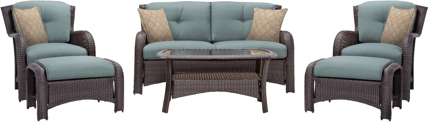 Hanover Strathmere 6-Piece Patio Conversation Set with Sofa, 2 Arm Chairs, 2 Ottomans, Accent Pillows and Tempered Glass-Top Coffee Table