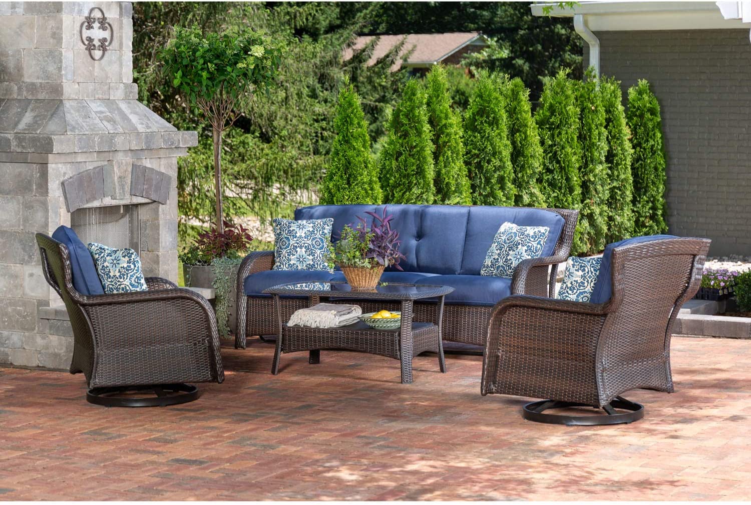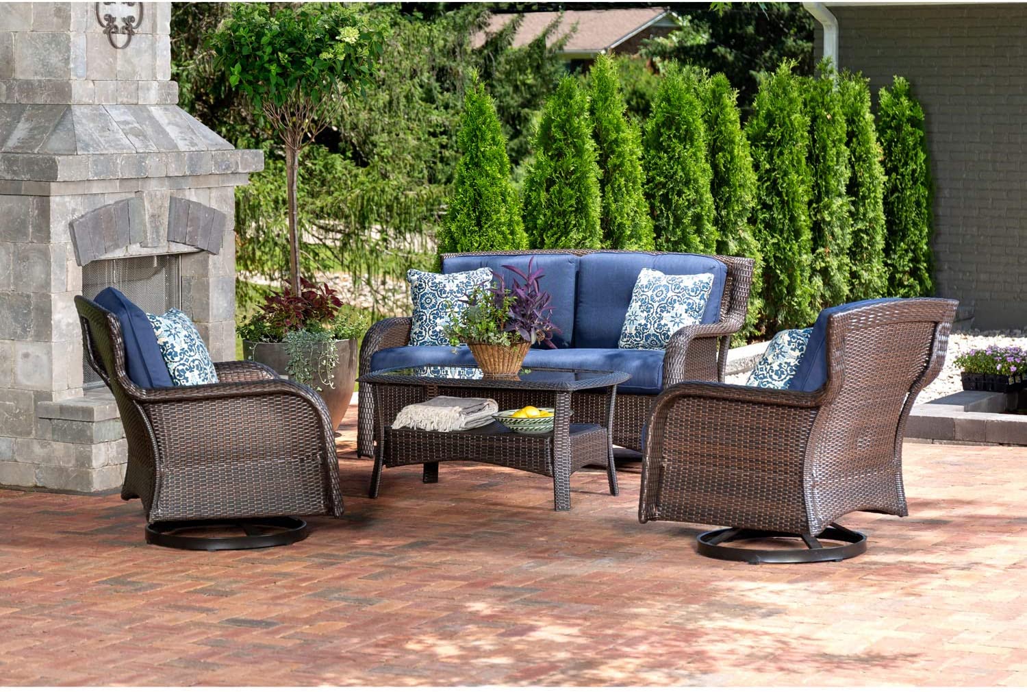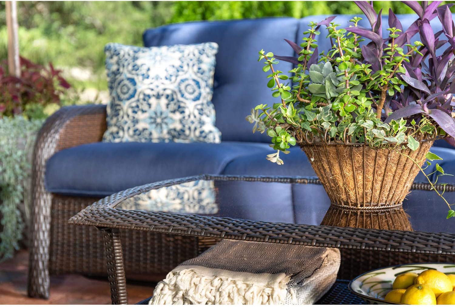 Hanover Strathmere 6-Piece Patio Conversation Set with Sofa, 2 Arm Chairs, 2 Ottomans, Accent Pillows and Tempered Glass-Top Coffee Table