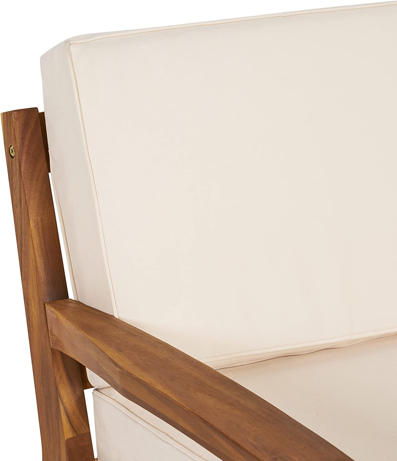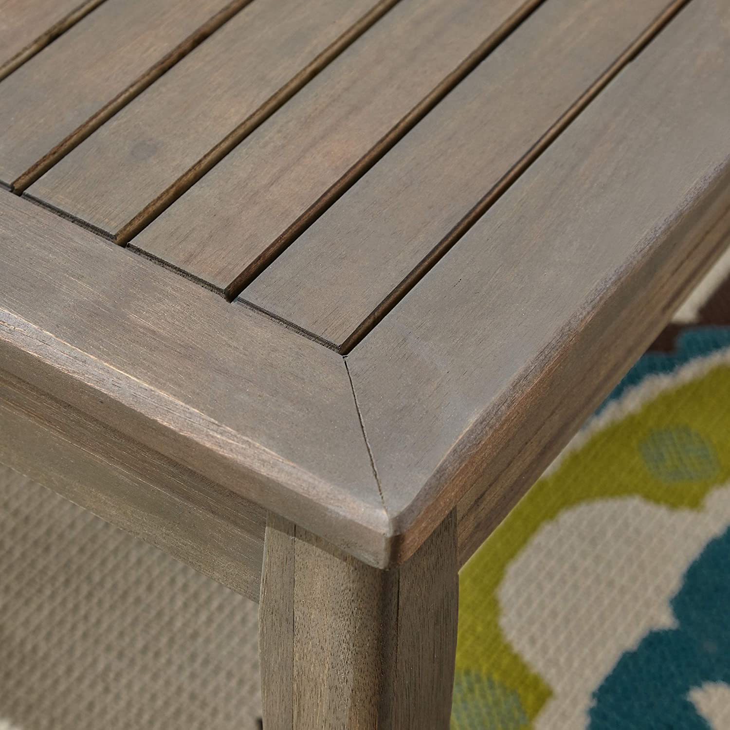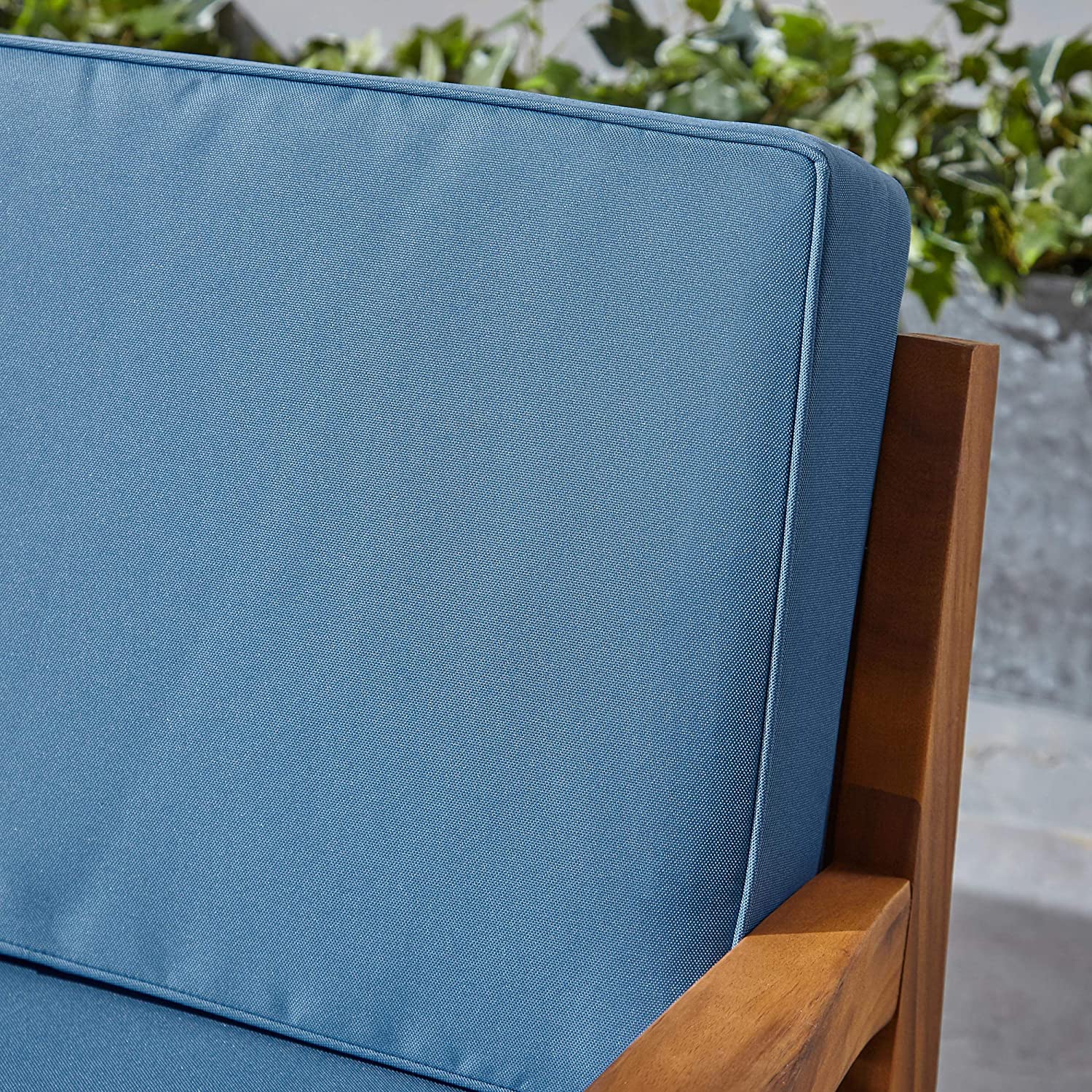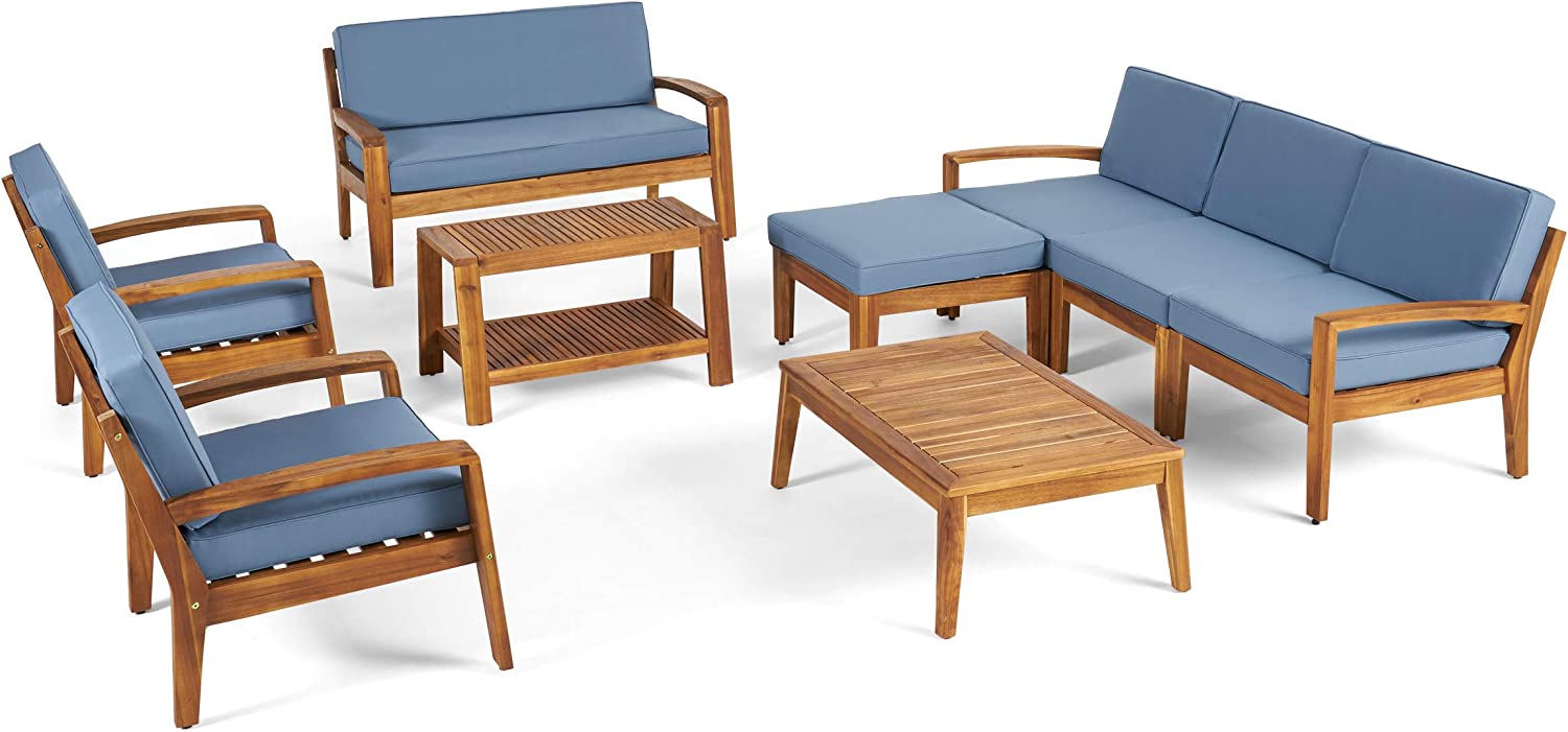 Great Deal Furniture Sally 7-Seater Sectional Sofa Set for Patio with Loveseat, Club Chairs, Ottoman, and Coffee Tables, Acacia Wood, Teak Finish with Blue Outdoor Cushions