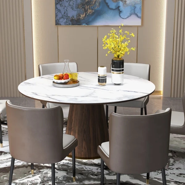 Mid-Century Modern 48" Round Dining Table White Faux Marble Tabletop for 6 Wooden Base
