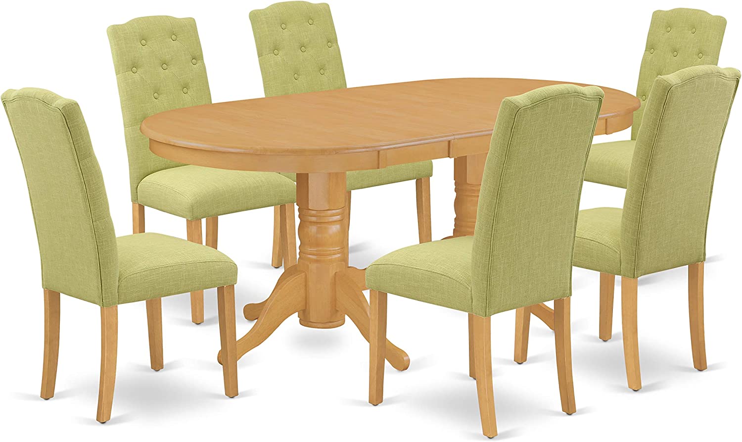 East West Furniture VACE7-OAK-07 7Pc Dinette Set Includes an Oval Dining Table with Butterfly Leaf and Six Parson Chairs with Lime Green Fabric, Oak Finish