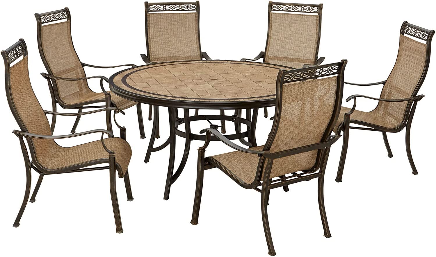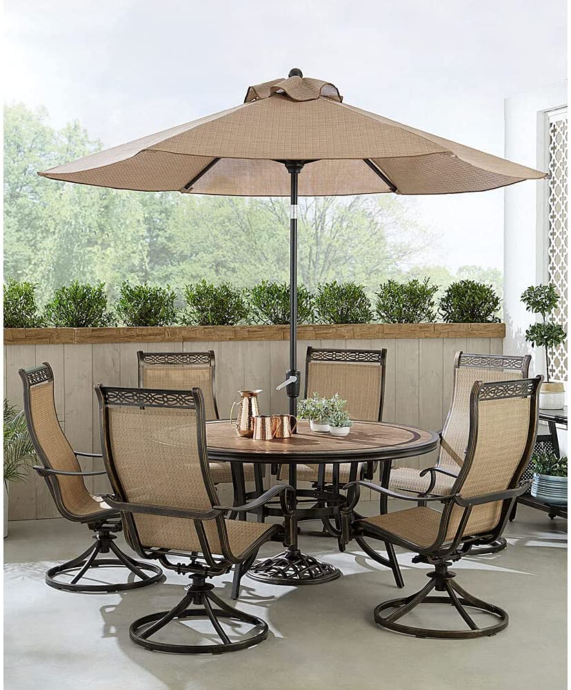 Hanover Montclair 7-Piece All-Weather Outdoor Patio Dining Set, 6 Swivel Rocker Chairs with Comfortable Tan Seat and Lumbar Cushions, 40"x66" Stamped Rectangle Table, MCLRDN7PCSQSW6-TAN