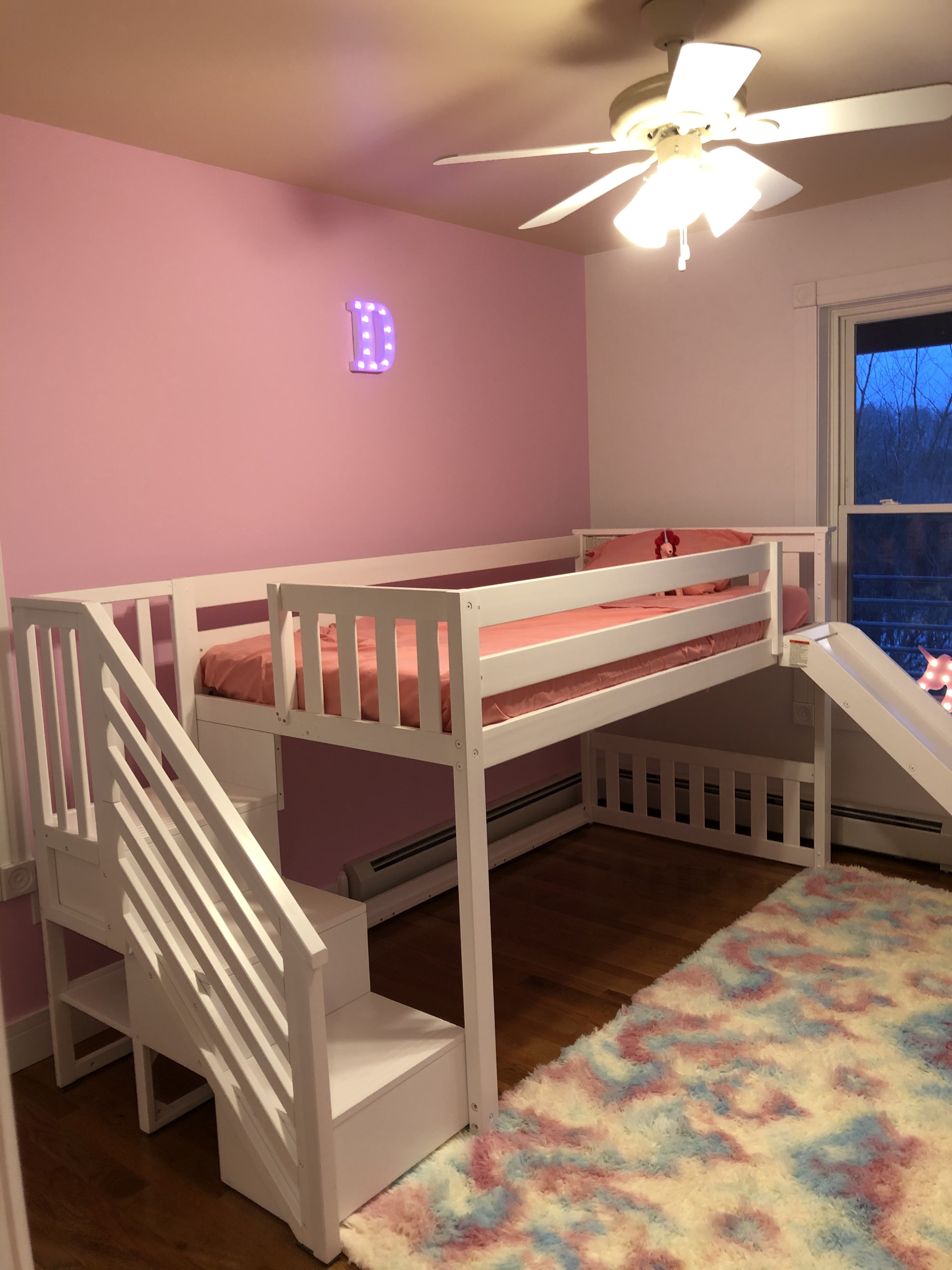 【Furniture】Princess Low Loft Stairway Bed with Slide Pink & White Tent & Tower, Loft Bed, Twin, White