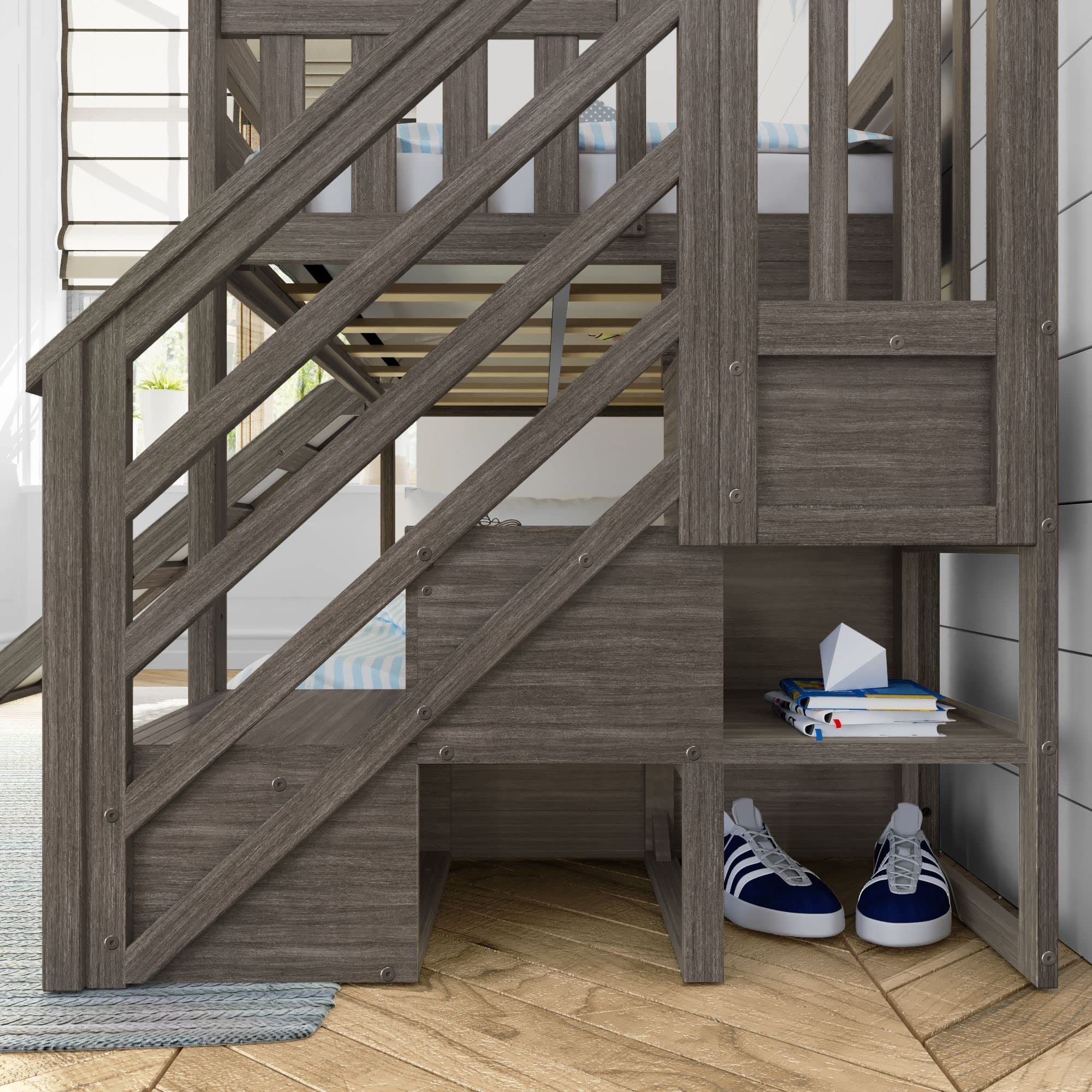 【Furniture】Double Full Bunk Bed Wooden Loft Bed, with Theater, Farmhouse, Ladder, Locker & Guardrail