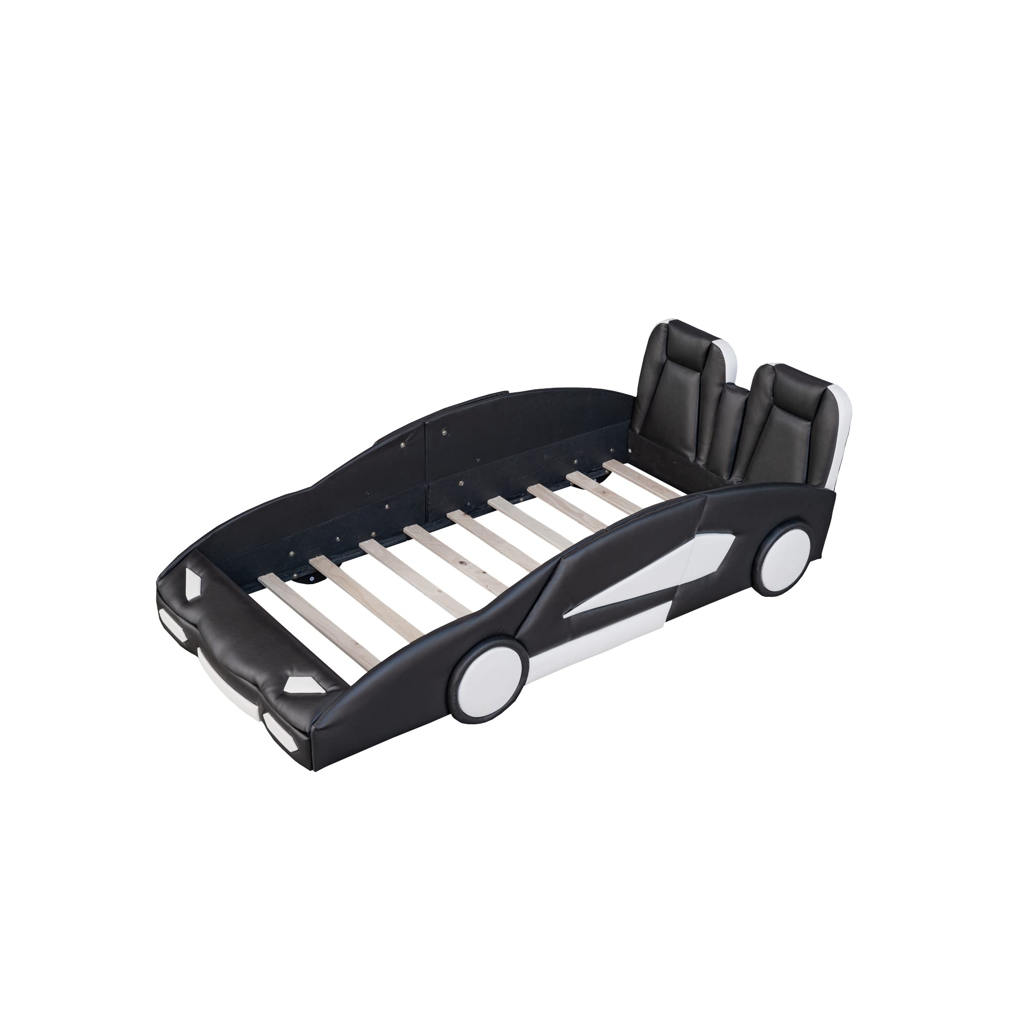 【Furniture】Twin Size Kids Platform Bed, Race Car-Shaped Bed with Wheels Design, Faux Leather Upholstered Bed Frame