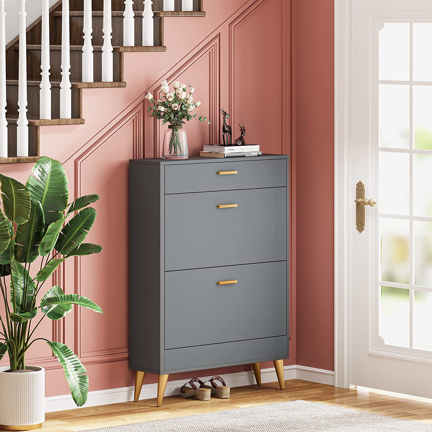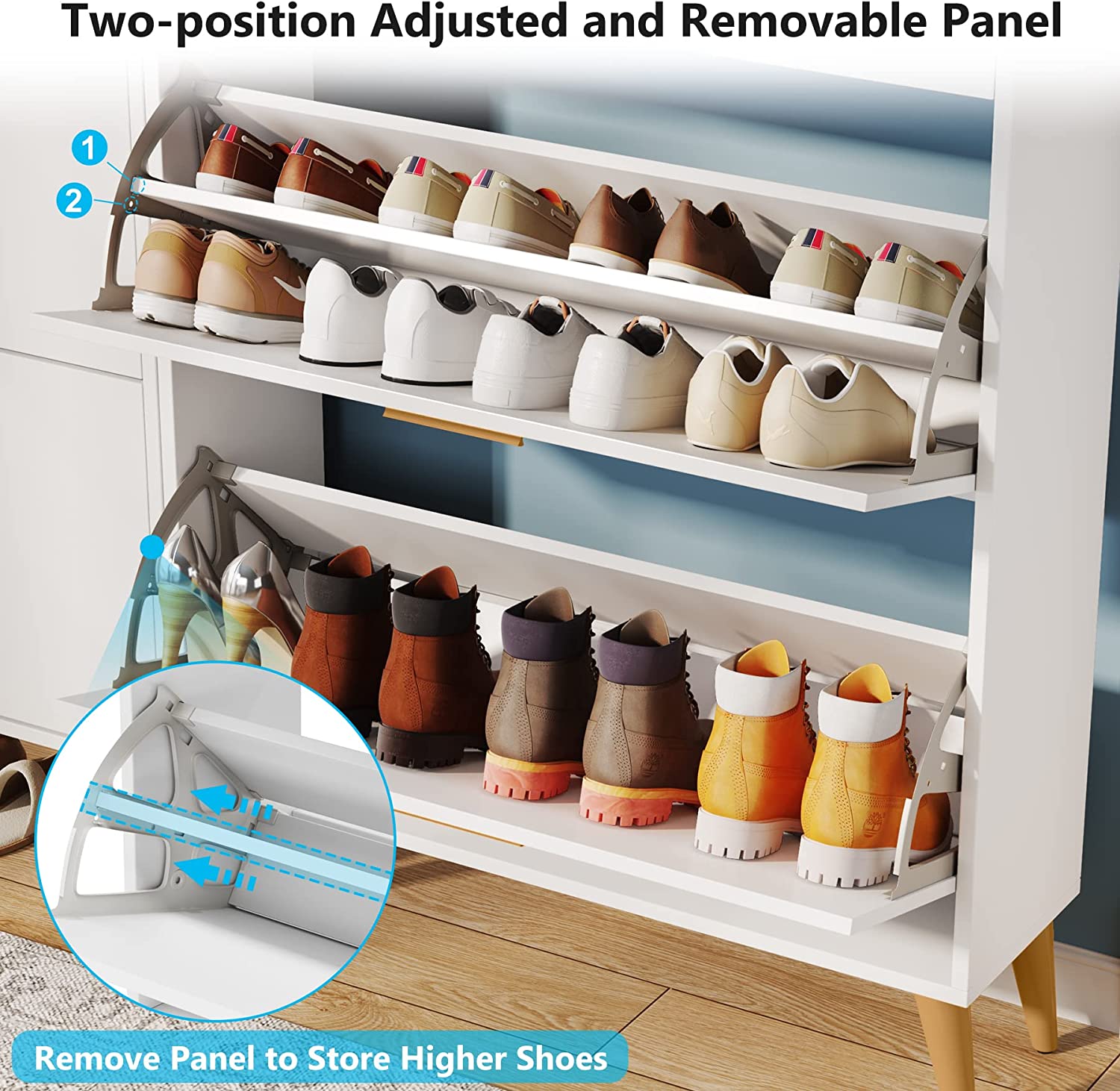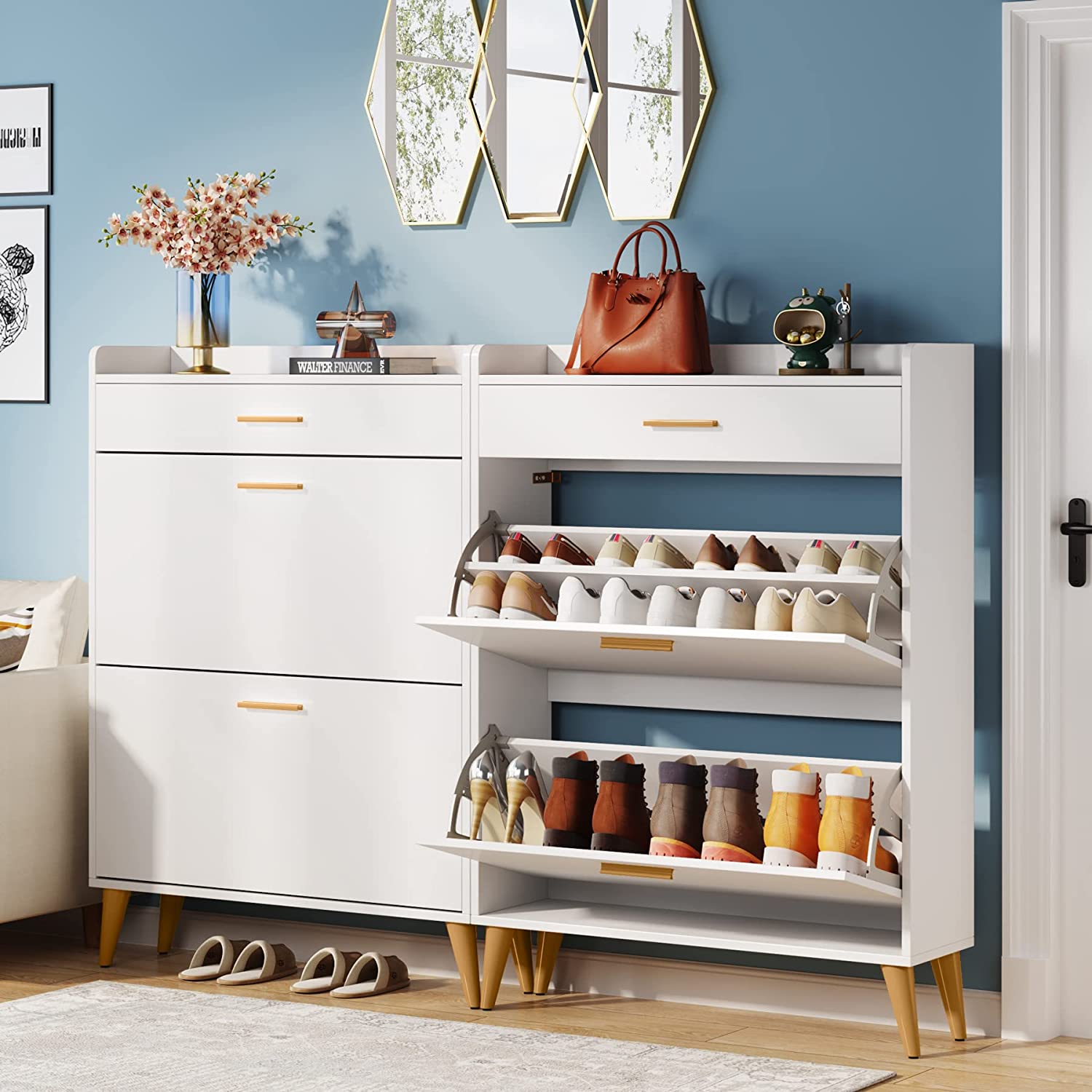 Tribesigns Shoe Cabinet, Entryway White Slim Shoe Storage Cabinet, Modern 16 Pair Thin Shoe Rack Organizer with 2 Flip Drawers (White + Gold)