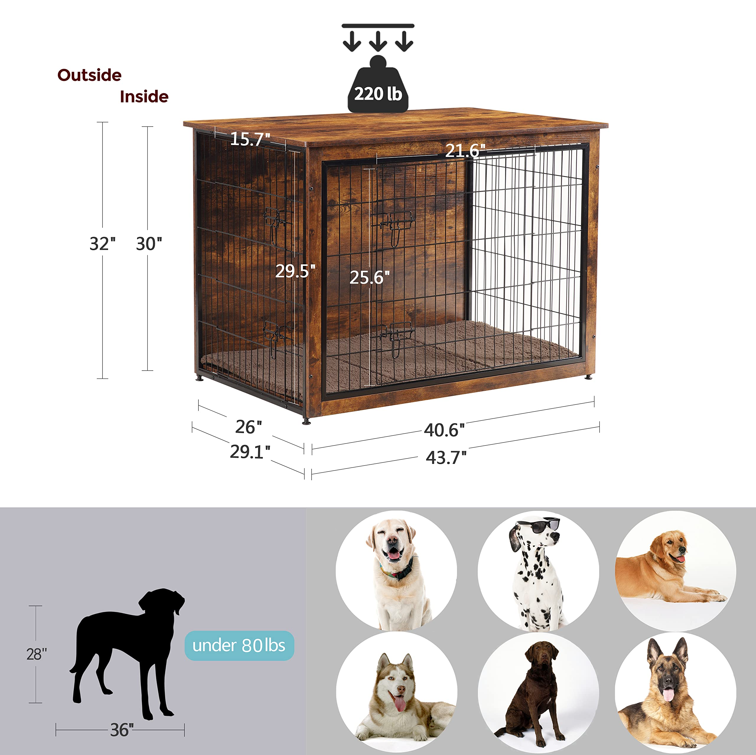【Pet】Dog Crate Furniture with Cushion, XL Wooden Dog Crate with Double Doors, Dog Furniture
