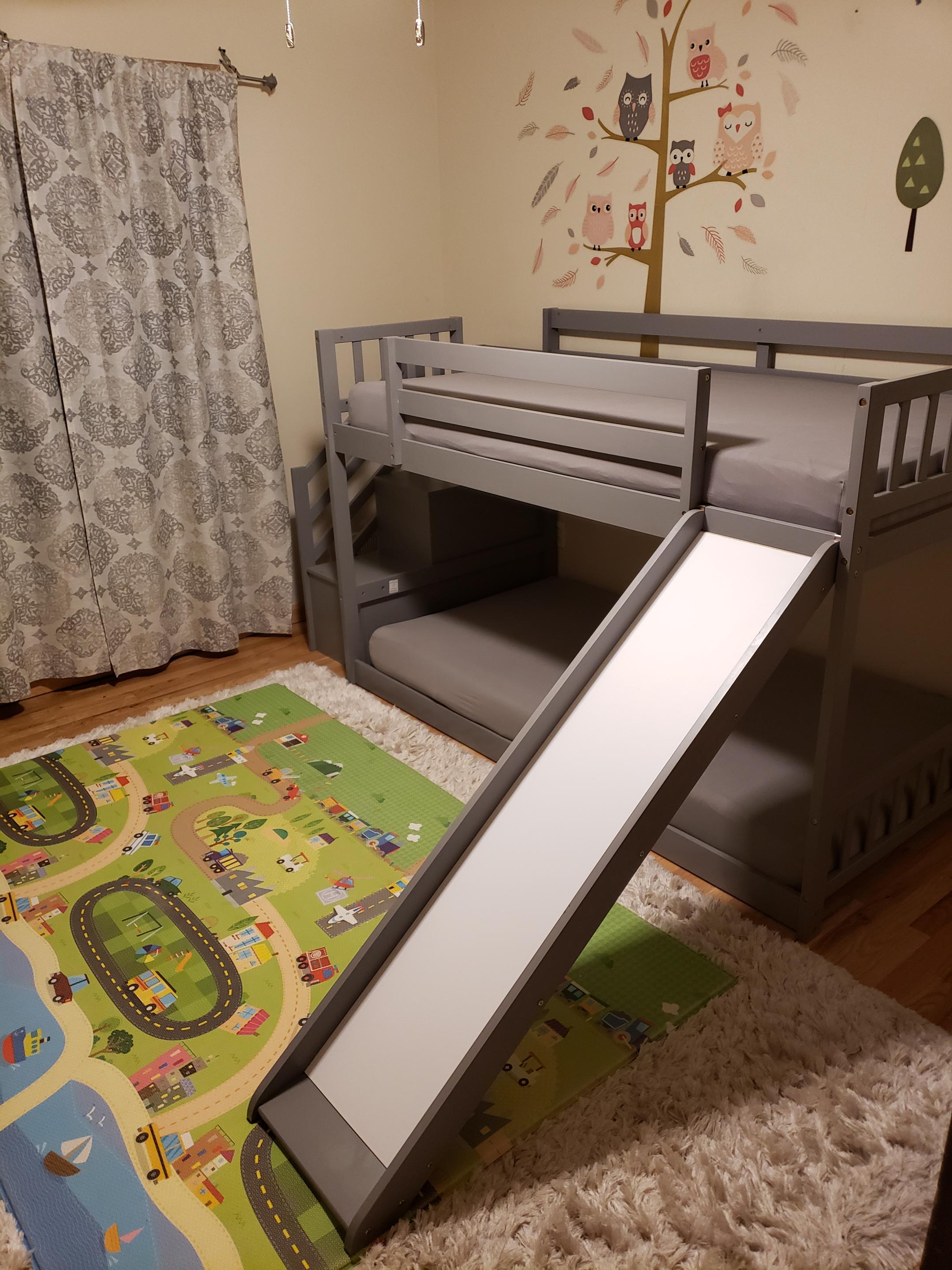 👉【Low Bunk Bed with Slide】The bunk bed is specially designed for children, The unique slide design meets the children's game needs.every child will love the multifunctional design, it will can turns your living room into a playroom. But Easily Removes When It’s No Longer Needed.