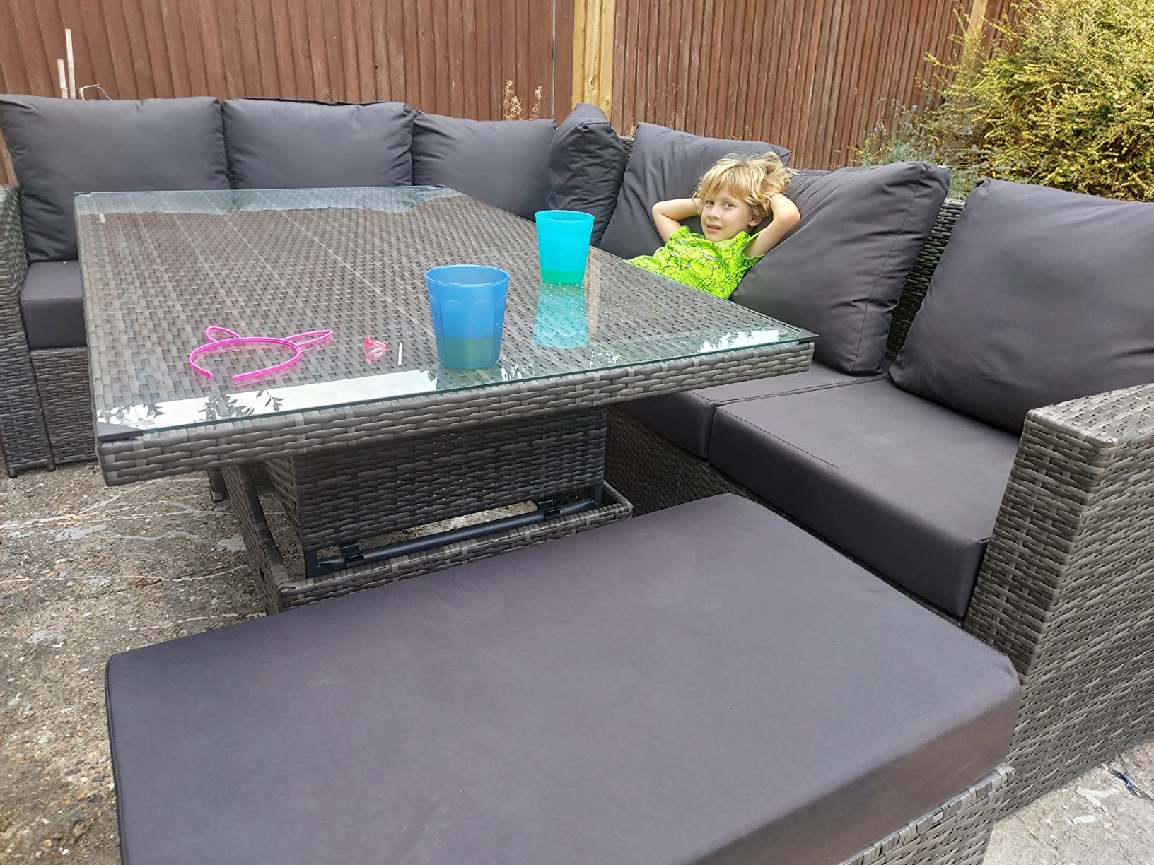 INCLUDES: 6/7 seat corner sofa | 1 x 2 person bench | 1 x Stool | Table with Fire Pit | Glass casing for the fire Pit | Cover for the fire pit area | Firestones | Grill trays | Waterproof Cover