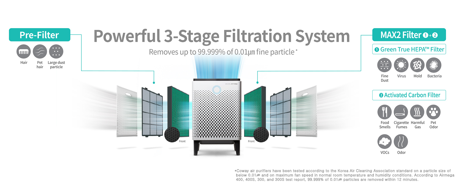- [HyperCaptive Filtration System] Combination of a pre-filter, deodorization filter, and True HEPA Filter reduces 99.999% of 0.01-micron particles, including pollen and other allergens. It also reduces 99% of volatile organic compounds and odor.
