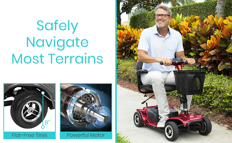SAFELY NAVIGATE SMOOTH SURFACES: Easily maneuver over smooth indoor surfaces and rough outdoor surface with the Vive Four-Wheel Mobility Scooter—with comfort and ease. Designed to safely support up to 265 pounds, the mobility scooter and its tires were engineered for durability and safety. Its easy-grip tires are flat-free, non-marking, and are 8”. Its maximum speed is 3.7 mph, and it has a driving distance up to 12.4 miles per charge.