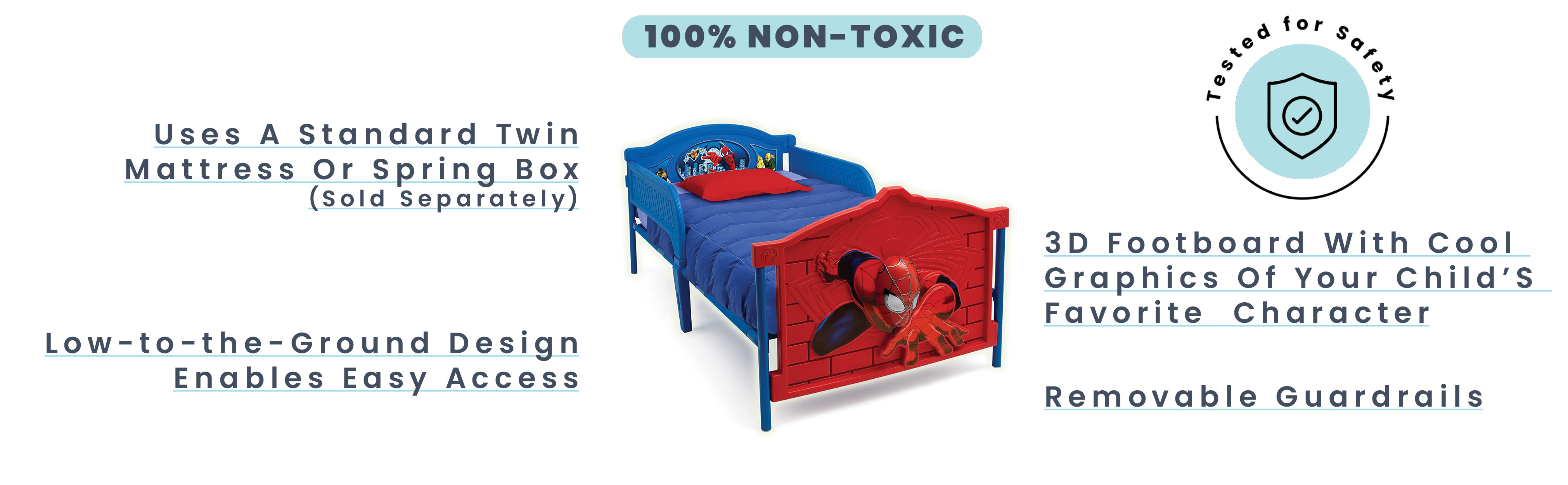 Designed to inspire action-packed dreams, this Marvel Spider-Man 3D Twin Bed from Delta Children is full of web-slinging fun! Featuring removable guardrails, plus 3D graphics and colorful decals of your child's favorite superhero at the headboard and footboard, it's a must for any Spidey fan.