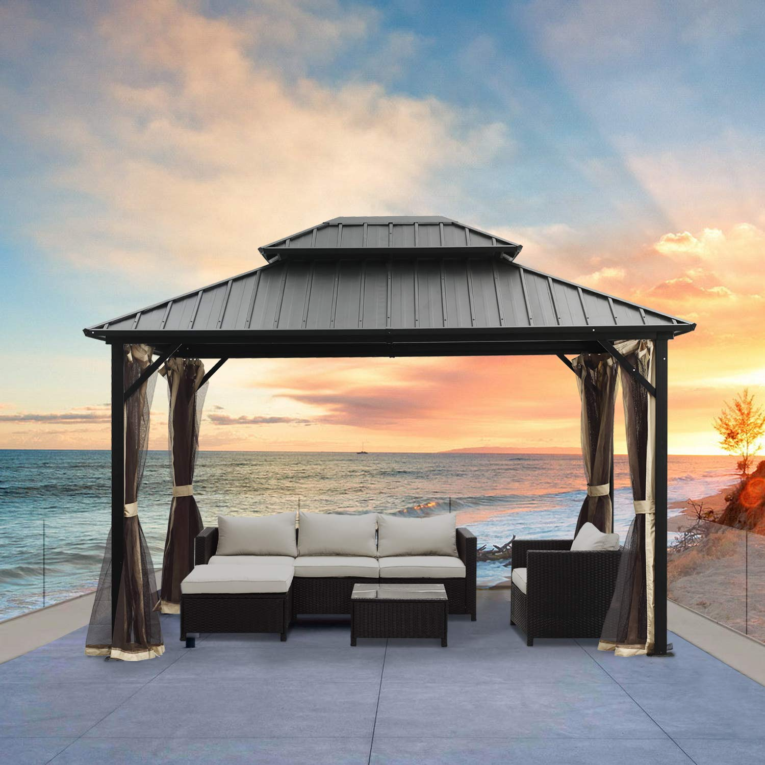 【Gazebo】10x12 Heavy Duty Galvanized Steel Hardtop Wyndham Patio Gazebo with Mosquito Netting