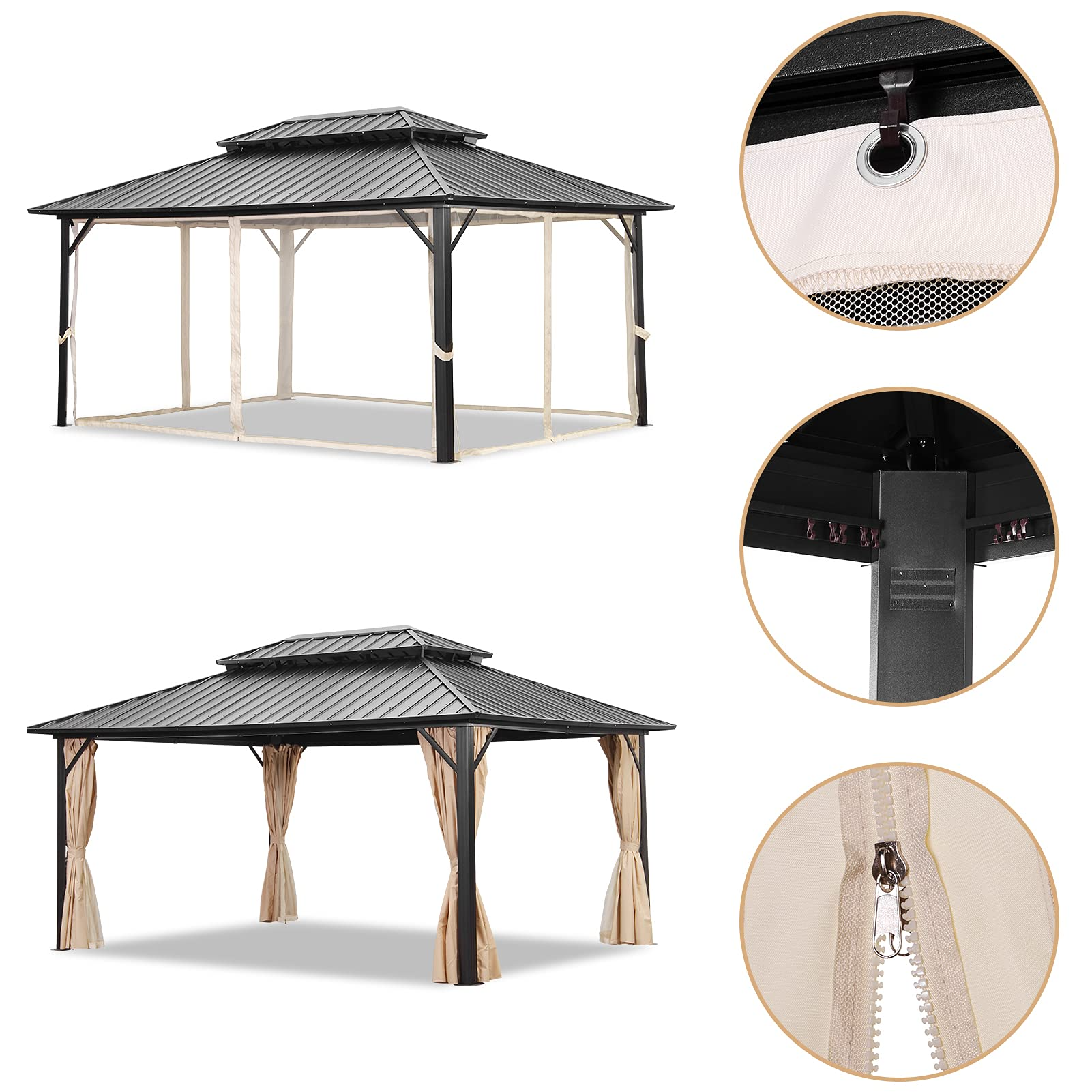 【Gazebo】12x16 Outdoor Patio Hardtop Gazebo with Netting, Galvanized Steel Double Roof Canopy Gazebo