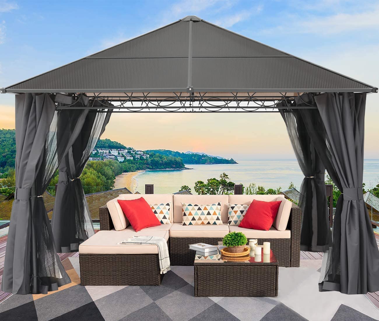 【Gazebo】10x12 Double Roof Hardtop Patio Gazebo Canopy Aluminum Frame with Netting & Screen Walls Curtains