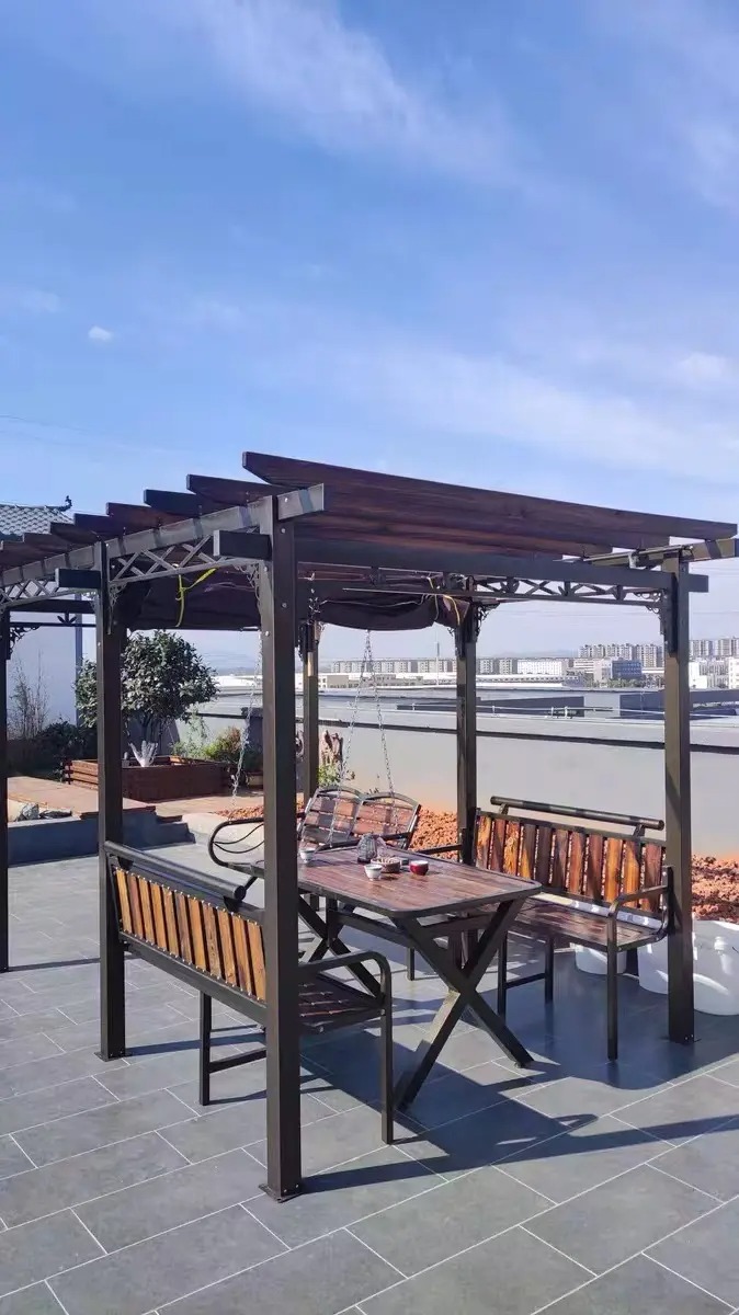 【Home&Garden】Glendale Modern Steel Cabana Pergola with Conversation Seating in Slate