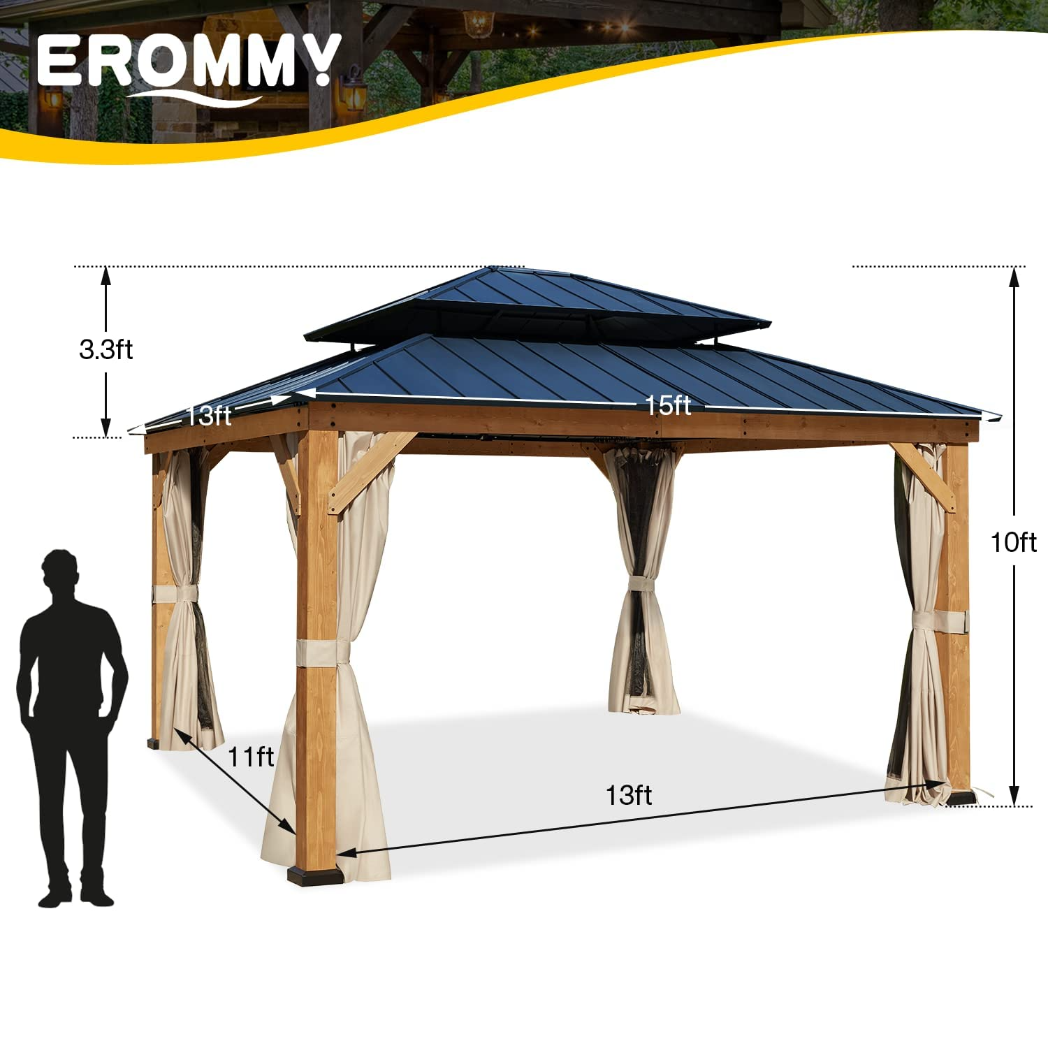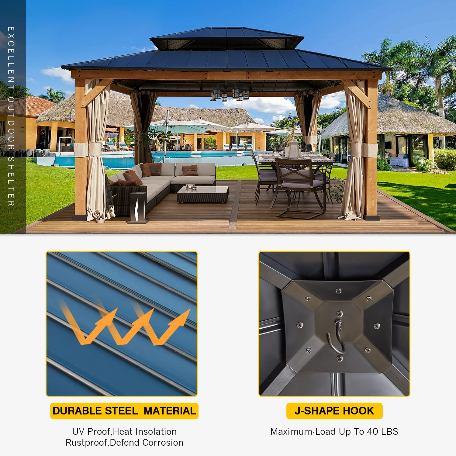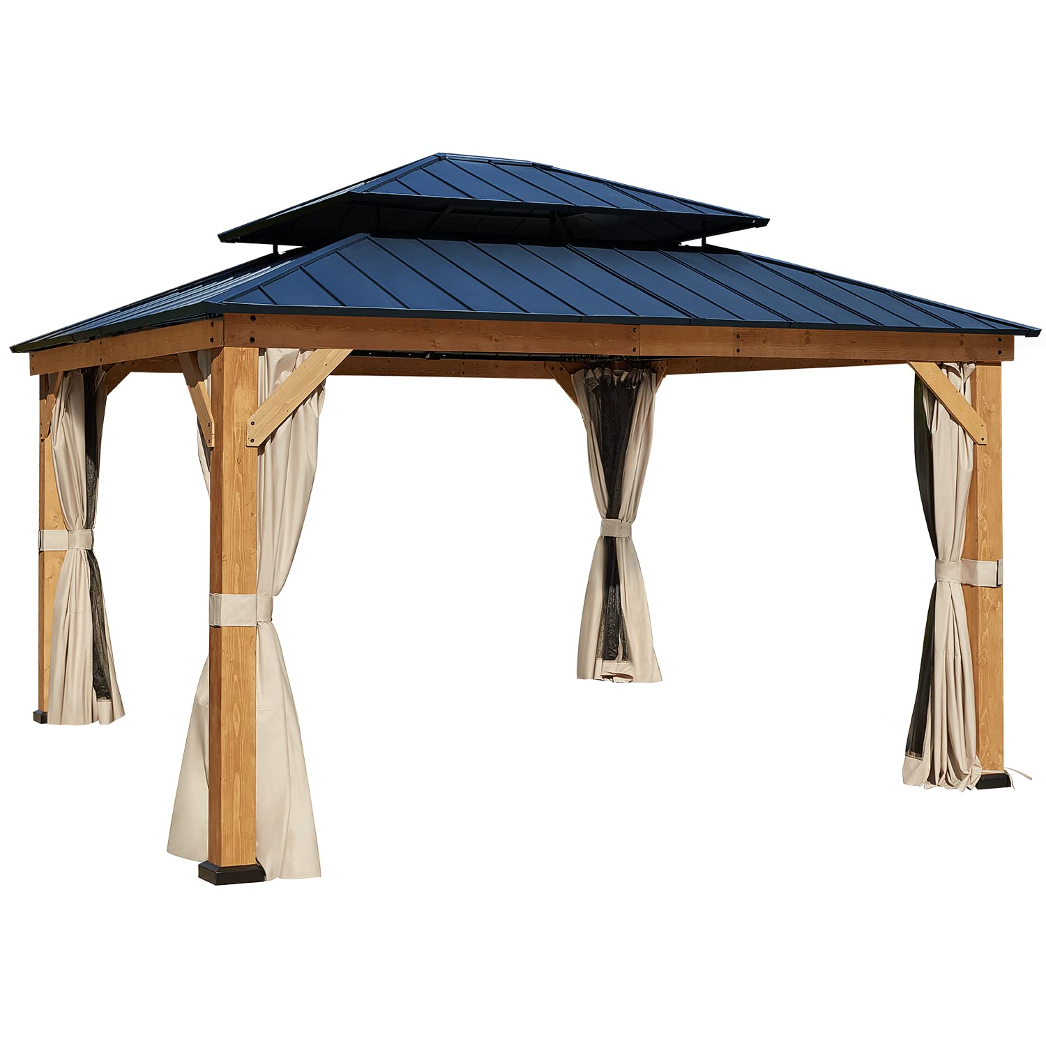 【Gazebo】13x13 Cedar Framed Octagon Wood Gazebo with Brown Double Tiered Steel Hardtop Roof & Ceiling Hook