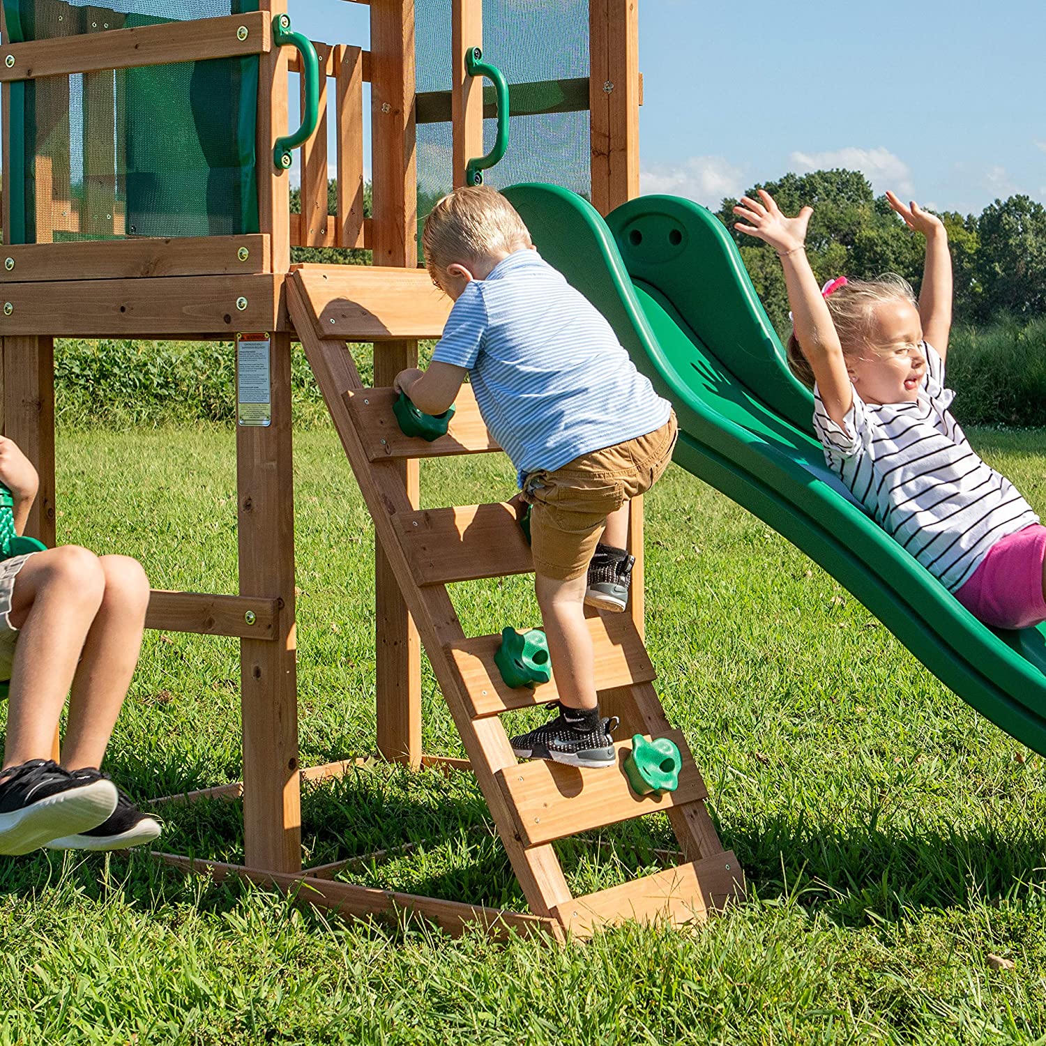 Backyard Discovery Buckley Hill Wooden Swing Set, Made for Small Yards and Younger Children, Two Belt Swings, Covered Mesh Fort with Canopy, Rock Climber Wall, 6 ft Slide