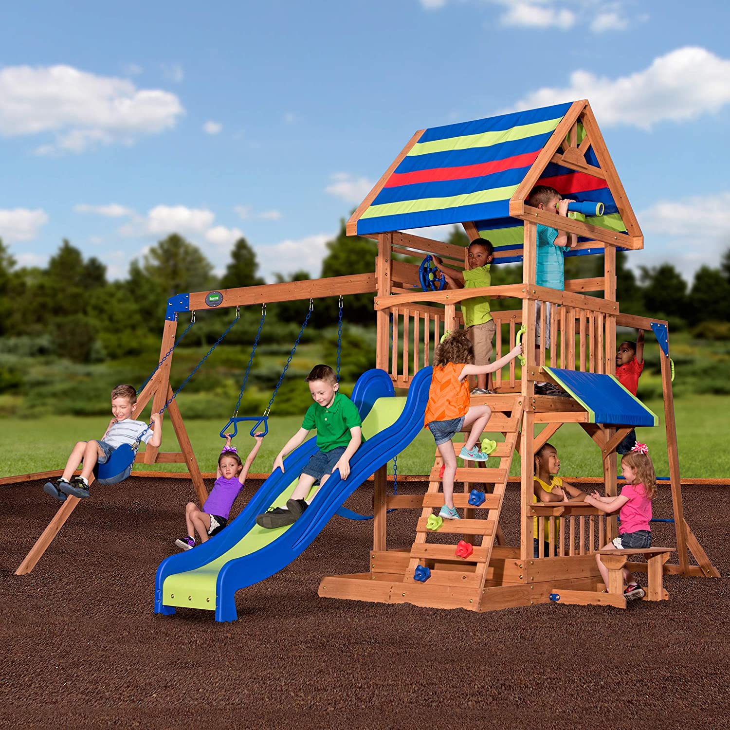 Backyard Discovery, Skyfort II Playground Cedar Wood Swing Set with Playhouse Fort, Sandbox, Picnic Table, Slide, Monkey Bars, Swings, Rock Climber, Outdoor Playset for kids Age 3-10 years