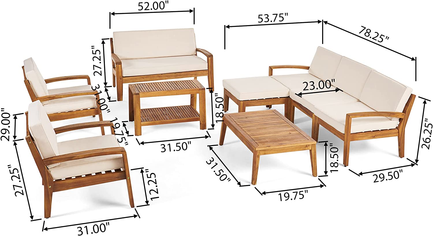 Great Deal Furniture Sally 7-Seater Sectional Sofa Set for Patio with Loveseat, Club Chairs, Ottoman, and Coffee Tables, Acacia Wood, Teak Finish with Blue Outdoor Cushions