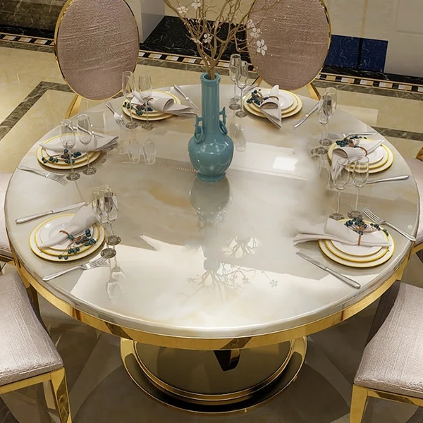 47" Modern Round Faux Marble Top Dining Table with Stainless Steel Base in Beige
