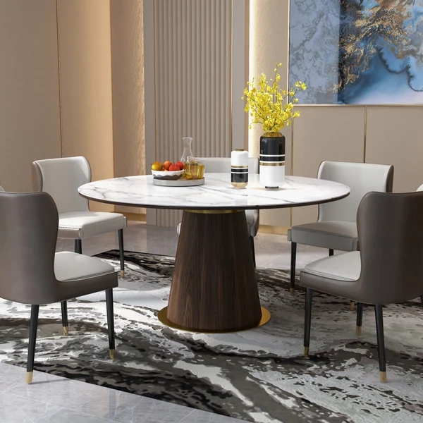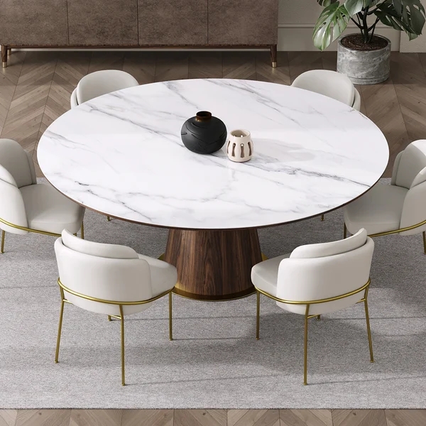 Mid-Century Modern 48" Round Dining Table White Faux Marble Tabletop for 6 Wooden Base