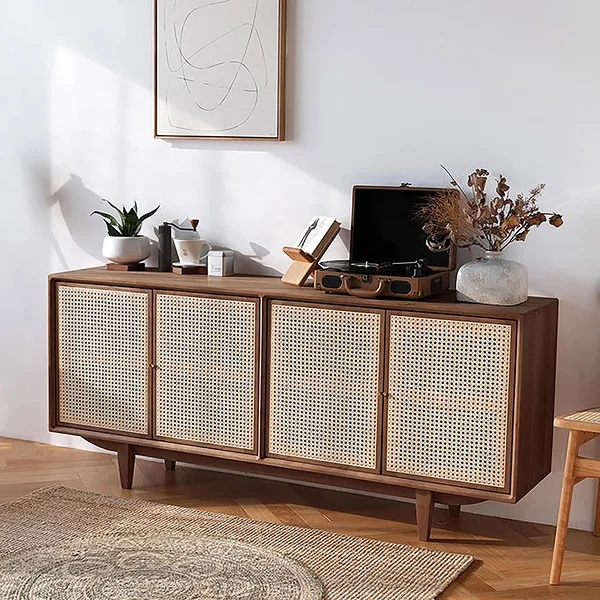 70" Nordic Walnut Sideboard Buffet Rattan Kitchen Cabinet with 4 Doors 4 Shelve in Large