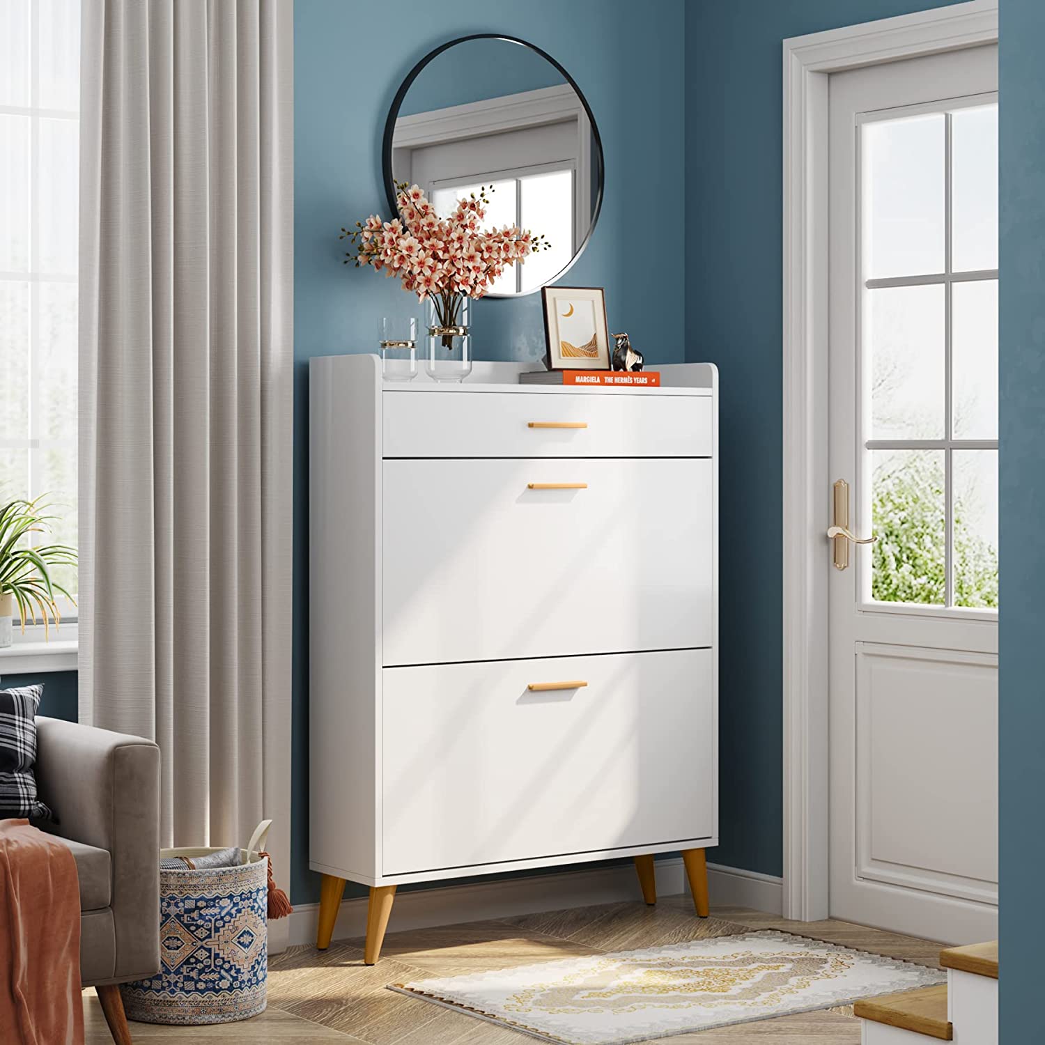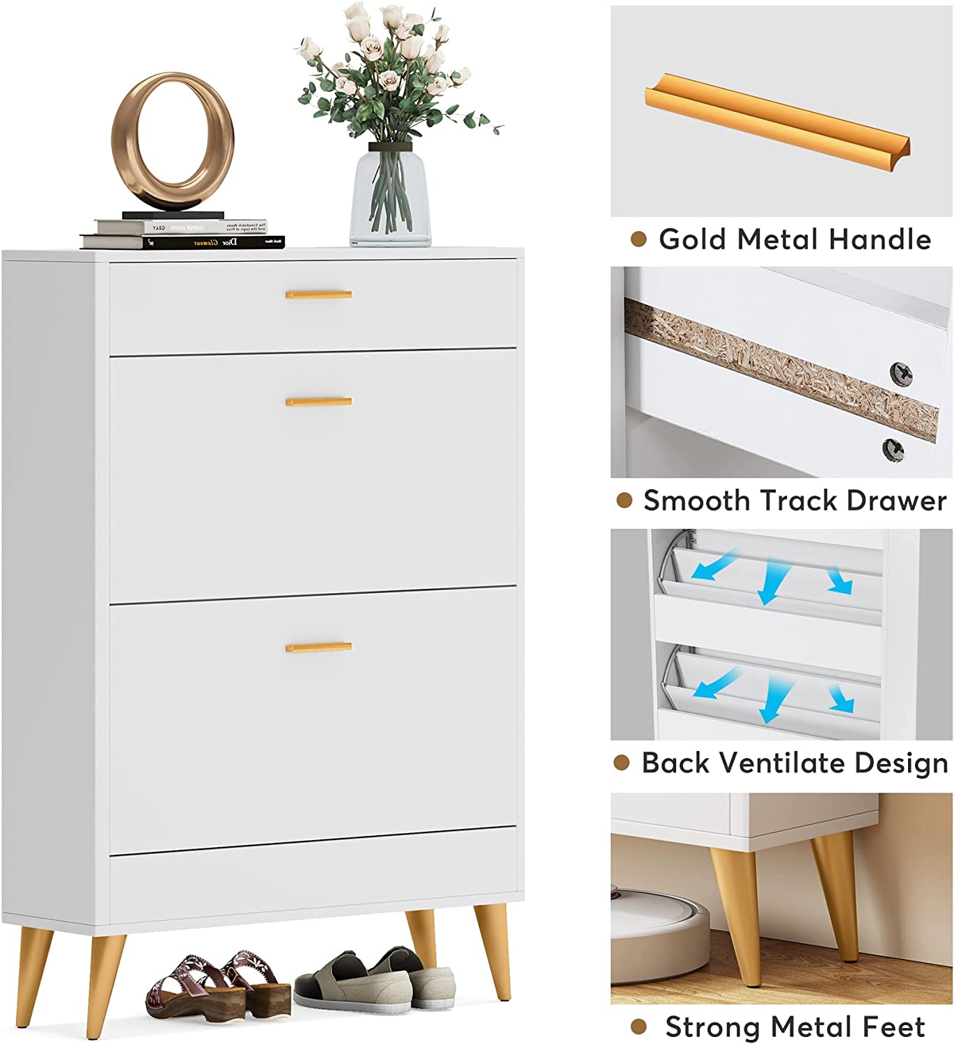 Tribesigns Shoe Cabinet, Entryway White Slim Shoe Storage Cabinet, Modern 16 Pair Thin Shoe Rack Organizer with 2 Flip Drawers (White + Gold)