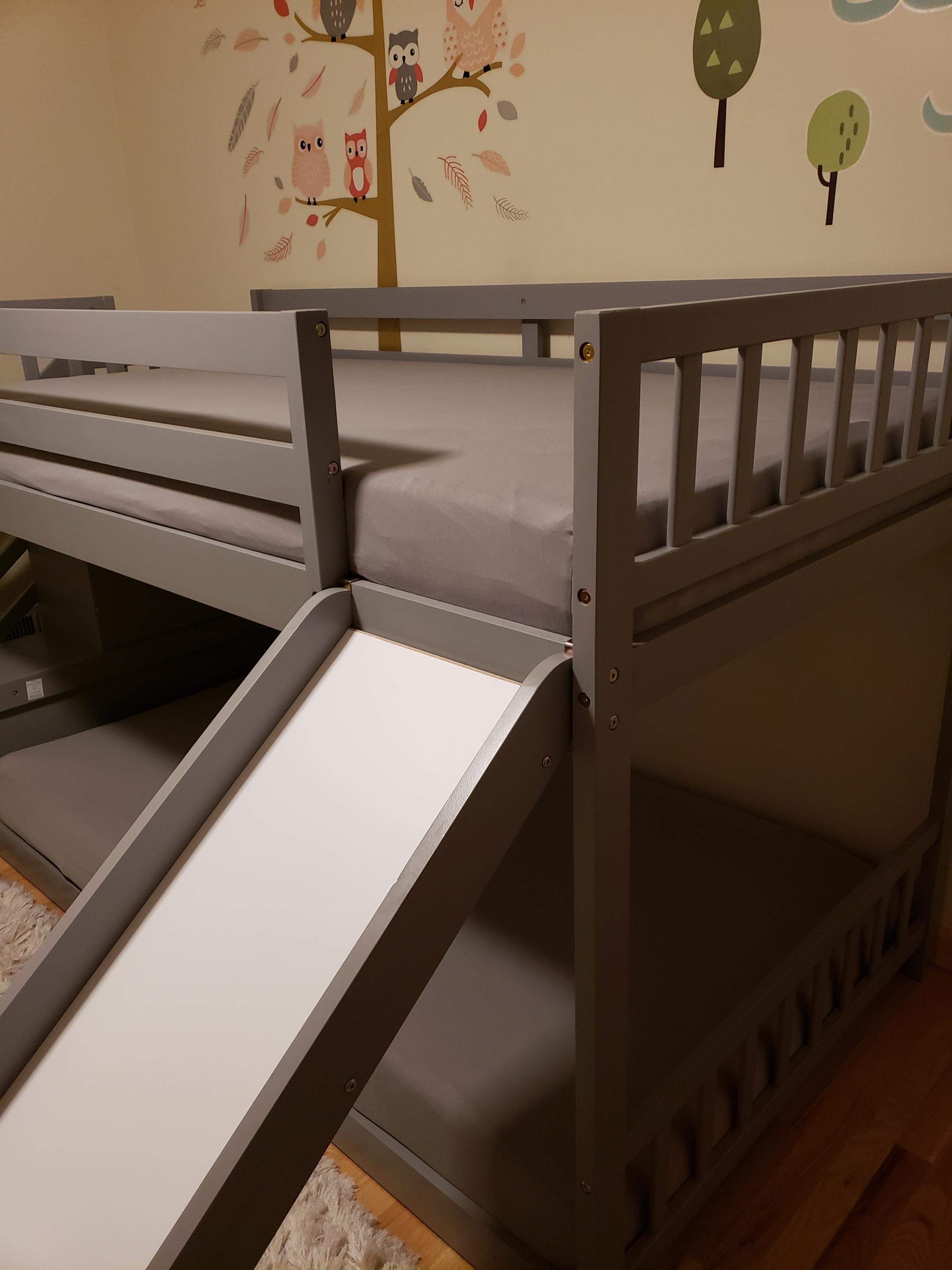 👉【Low Bunk Bed with Slide】The bunk bed is specially designed for children, The unique slide design meets the children's game needs.every child will love the multifunctional design, it will can turns your living room into a playroom. But Easily Removes When It’s No Longer Needed.