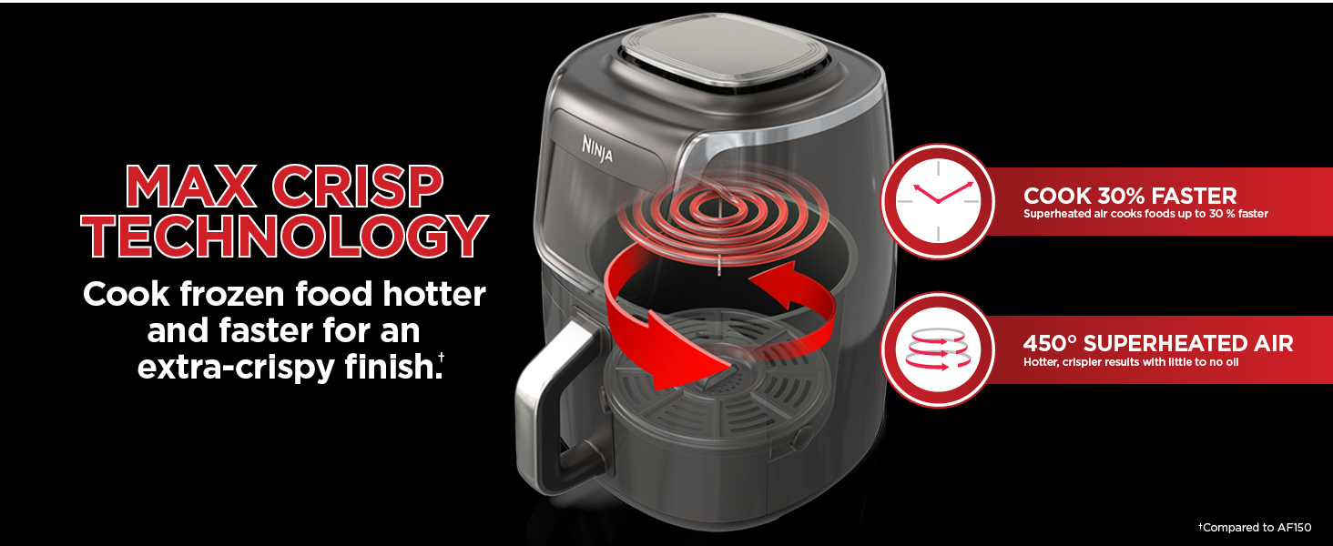 - MAX CRISP TECHNOLOGY: Delivers 450 degrees of superheated air to cook foods up to 30 % faster (Versus Ninja AF100) for hotter, crispier results with little to no oil for guilt free fried favorites.