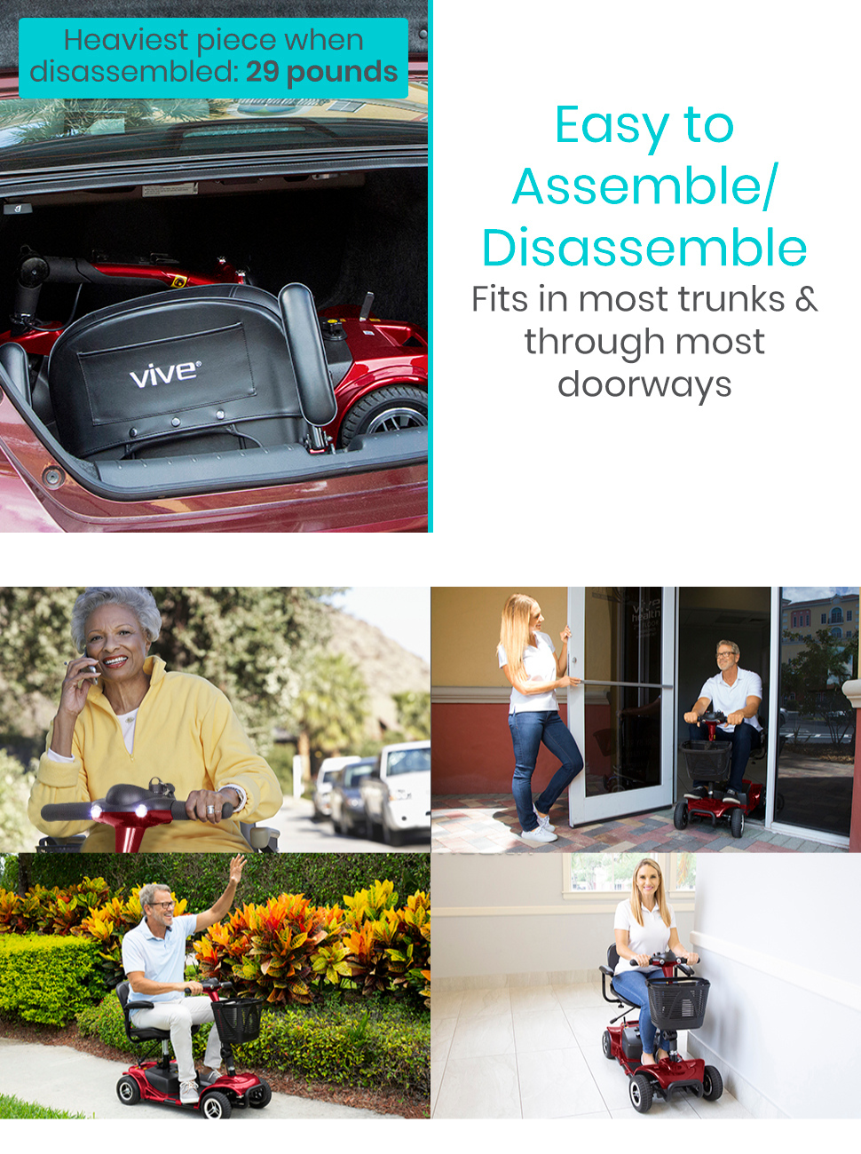 EASY TO TRANSPORT: Quickly disassemble the Vive mobility scooter into four separate pieces for easy portability. Featuring a folding tiller and removable seat, each section easily fits in the trunk of standard size vehicles. The rear section weighs only 29 pounds and is the heaviest of the four pieces.