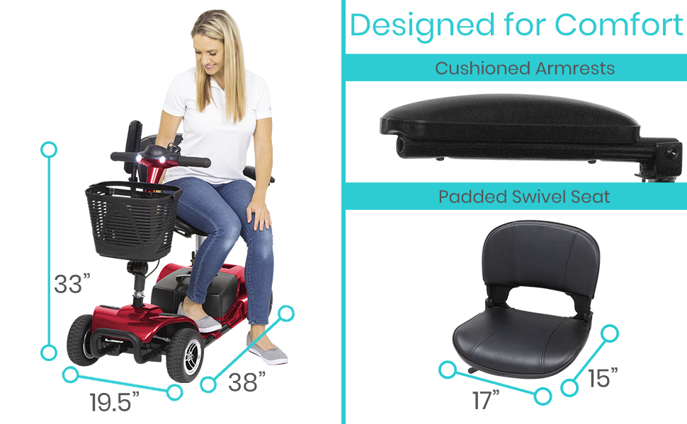 COMFORTABLE SEATING: Comfortably padded, the wide, 15.75” seat and backrest provide gentle cushioning and support. The swivel seat rotates, allowing you to more easily step off the scooter without aggravating back pain. The height-adjustable seat can easily be customized with the push of a lever, for a more comfortable fit. The scooter is also surrounded by two padded armrests that adjust and flip upward—for greater convenience when exiting or boarding.